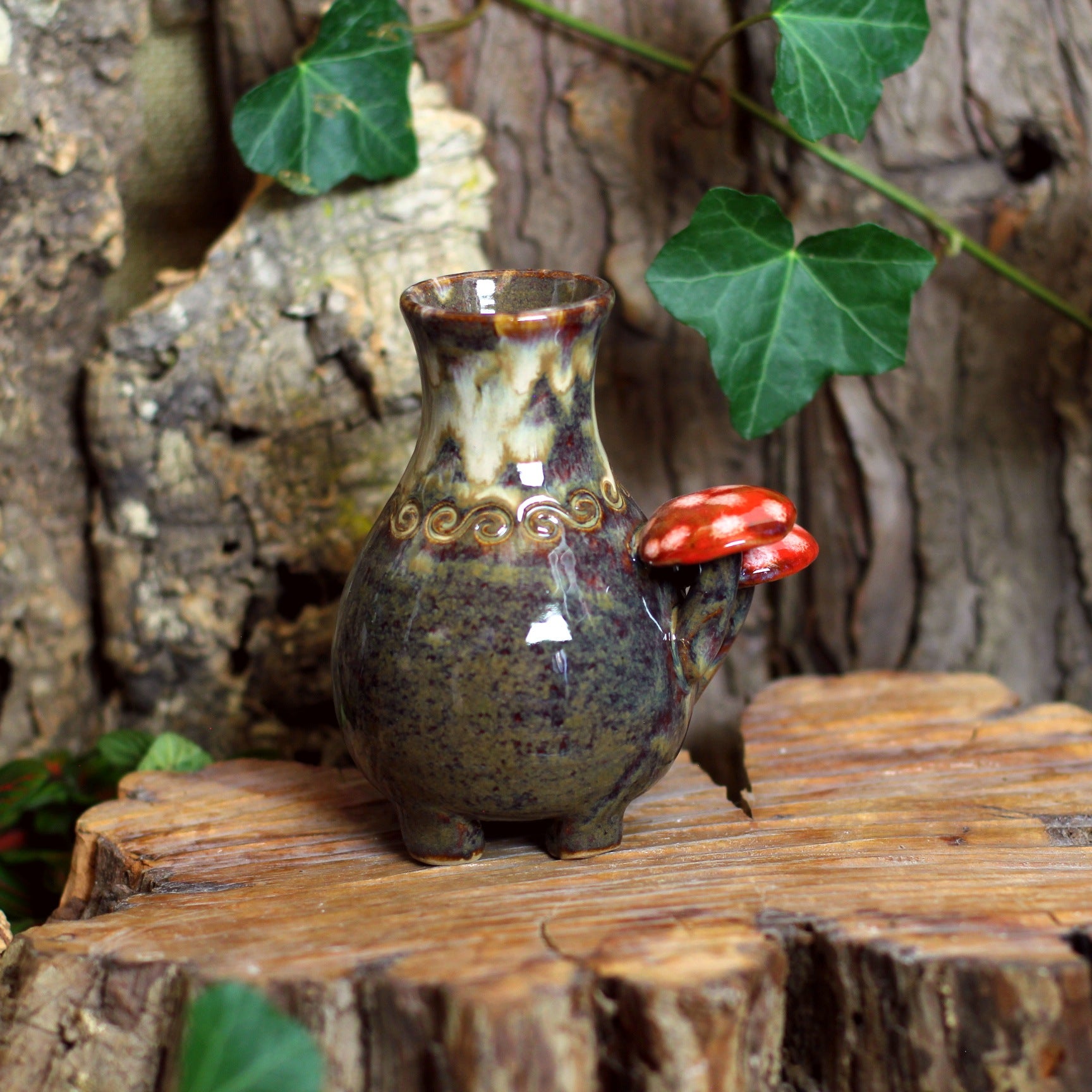 I put the creations together in about two weeks. I use stoneware clay, weigh it, knead it, and then the party starts on the turntable. Once that is done, I decorate the item and add a handle if necessary. Once dried, I put it in the oven at 900°C (1652°F) degrees.