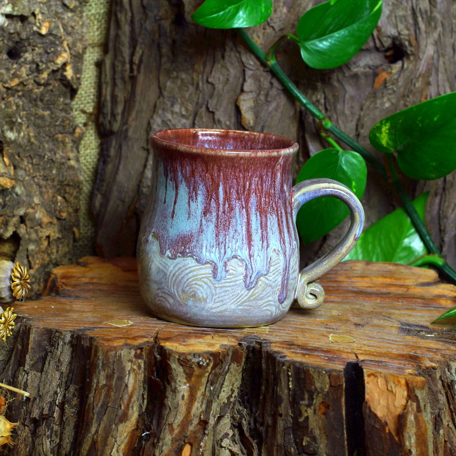 I put the creations together in about two weeks. I use stoneware clay, weigh it, knead it, and then the party starts on the turntable. Once that is done, I decorate the item and add a handle if necessary. Once dried, I put it in the oven at 900°C (1652°F) degrees.